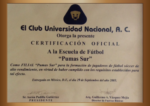 Pumas Sur es una escuela que además de enseñar la práctica del futbol ayuda a fomentar en niños y jóvenes principios y valores, estos inculcados por profesores profesionales y capacitados por el club universidad para que antes que todo y fundamentalmente sean buenos seres humanos útiles a la sociedad por medio del deporte.